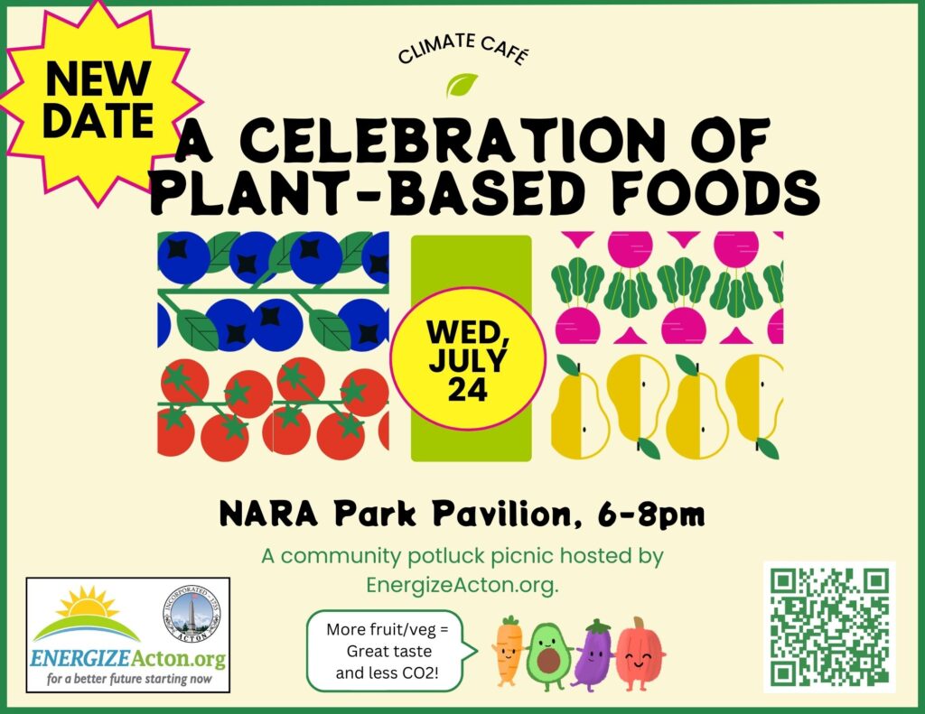 This July 24th, EnergizeActon.org will again host the community potluck picnic, A Celebration of Plant-Based Foods, at the NARA Park Pavilions from 6:00-8:00pm. Eating more plant-based food is an immediate and DELICIOUS way to put less CO2 into the atmosphere. Please, you do not need to be a vegetarian or vegan chef. Just bring a plant-based dish that you enjoy. Even a simple bowl of fruit will be appreciated. The idea is to sample favorite plant-based recipes from across the community and to celebrate the wonderful bounty of the plant world.