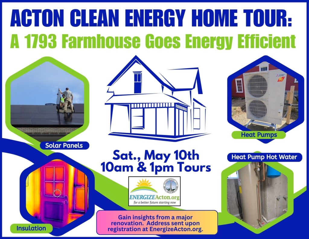 We are optimistic that an official Acton Clean Energy Coach will also be on hand for these tours. There will be a 10:00am session and a 1:00pm session. As usual, coffee and snacks will be on hand, along with the latest resources from EnergizeActon.org, including the most up-to-date information on incentives.
