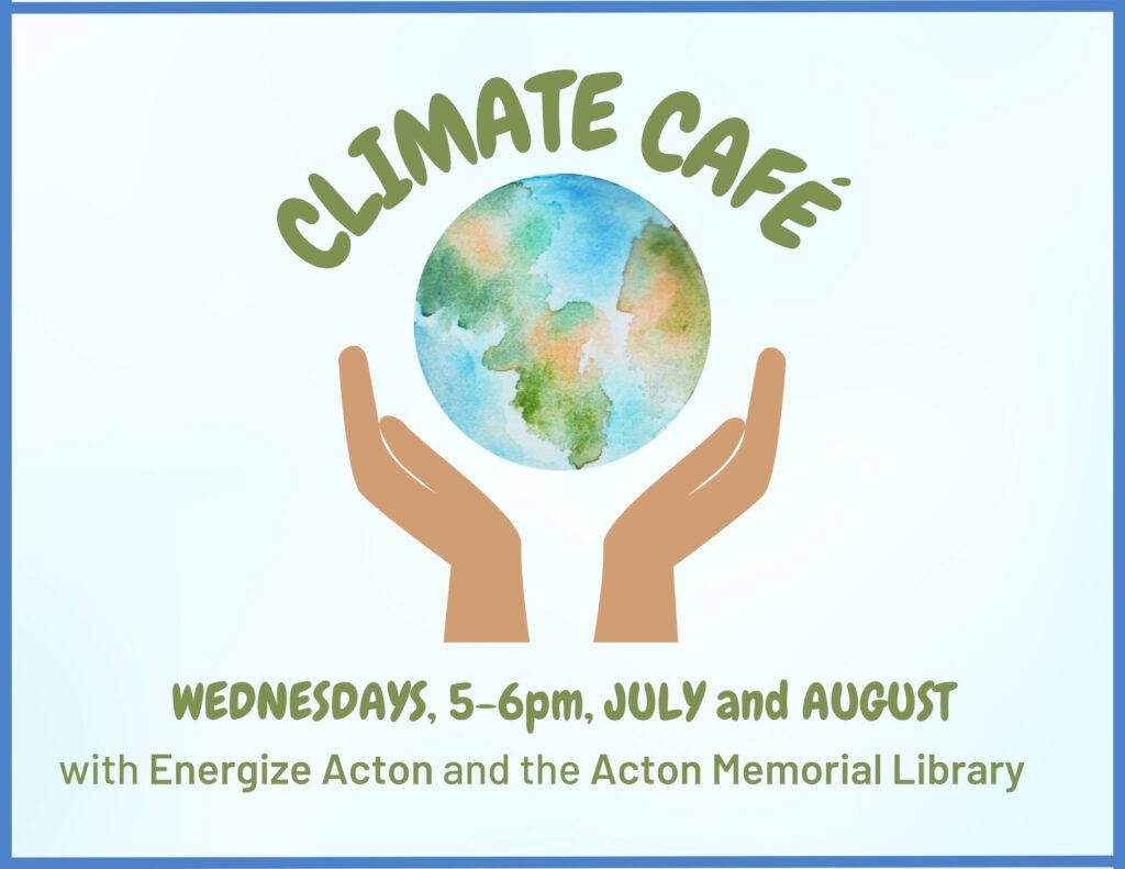 The Climate Café aims to be a helpful, informal gathering where Acton residents can discuss a fossil fuel free future. Local people who have experience in clean energy technologies will share their insights and answer questions from others who are considering these technologies and who are exploring ways to reduce their carbon footprints. Each week in July and August will be a different focus, with a range of technical and environmental topics. Each session will be one hour, 5:00-6:00pm, on Wednesdays. When the weather is good, we will be outside behind the Acton Memorial Library (486 Main St, Acton, MA), so feel free to bring a picnic or grab a slice of pizza and relax while we discuss these positive efforts. If the weather is wet, we will be inside in the Library’s meeting room on the first floor. (Sorry, food is discouraged inside.)