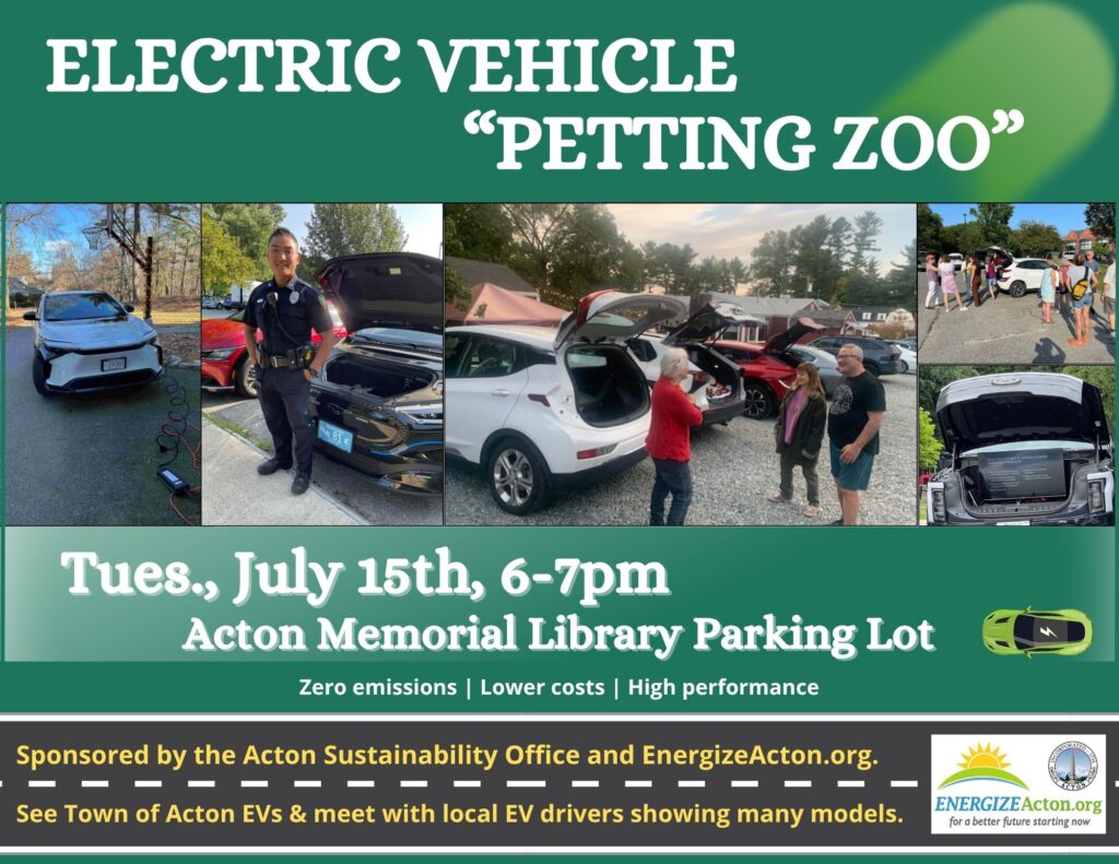 Even in our uncertain times, electric vehicles continue to advance and amaze. With zero emissions, high performance, and low maintenance costs, EVs are fun to own. And, of course, they are critical to the effort to address our warming climate. EV drivers are huge champions of this technology. The EV Petting Zoo* is a chance for you to talk with local EV drivers and see a variety of electric vehicles, with passenger models from Ford, Toyota, Chevrolet, Subaru, Kia, Hyundai, and more; plus the Town of Acton will be showcasing some of their electric vehicles. We welcome all who are thinking about an electric vehicle AND we welcome folks who have recently purchased an EV and would like to share their experiences. You can sign up to join us or simply come by!