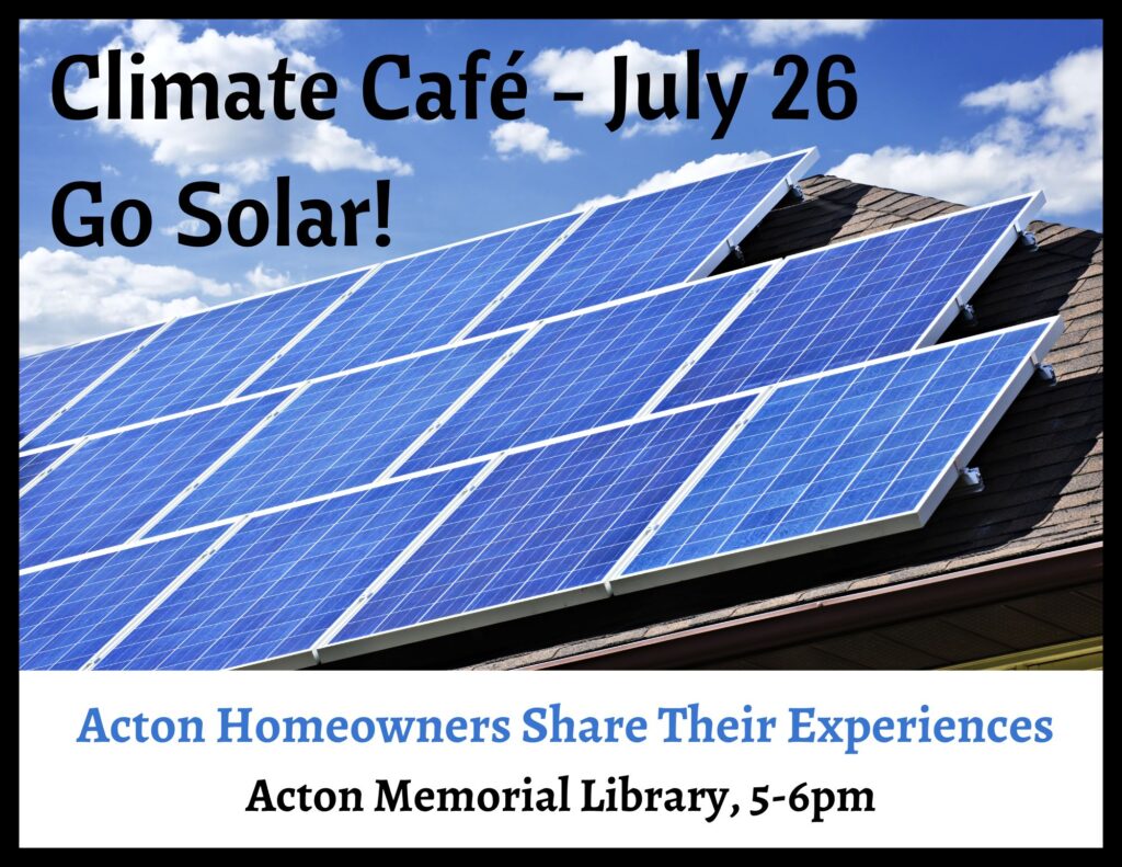 Each Climate Café aims to be a helpful, informal gathering where Acton residents can discuss a fossil fuel free future. Local people who have experience in clean energy technologies will share their insights and answer questions from others who are considering these technologies and who are exploring ways to reduce their carbon footprints. Each week in July and August will be a different focus, with a range of technical and environmental topics. Each session will be one hour, 5-6pm, on Wednesdays. When the weather is good, we will be outside behind the Acton Memorial Library, so feel free to bring a picnic or grab a slice of pizza and relax while we discuss these positive efforts. If the weather is wet, we will be inside in the Library’s meeting room on the first floor. (Sorry, food is discouraged inside.) No need to register. Simply drop by the library.