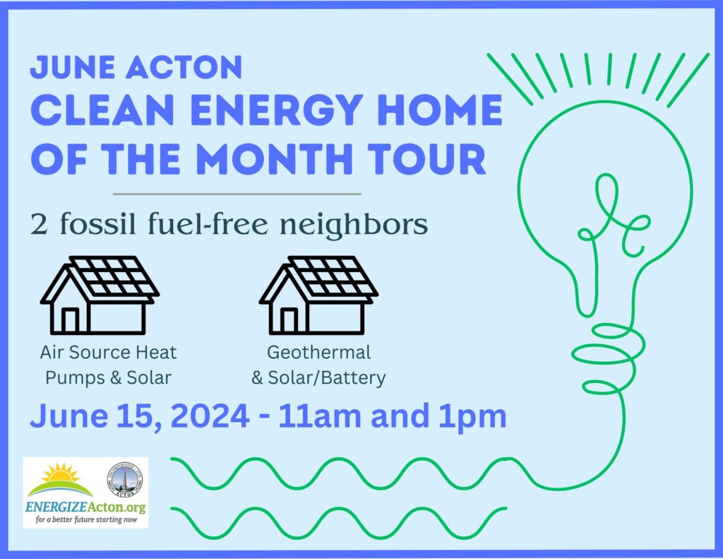 Our monthly tours are part of a broader campaign called “PlugIN,” running from February through July 2024 and coordinated with groups across Acton and the region to reduce greenhouse gas emissions. The new movement for electrification—based on renewable energy sources and high-efficiency home heating, cooling, and appliance use—is part of Acton’s commitment to reach net zero emissions as soon as possible. To find out about efforts in other PlugIN towns—Wayland, Framingham, and Natick–click HERE.