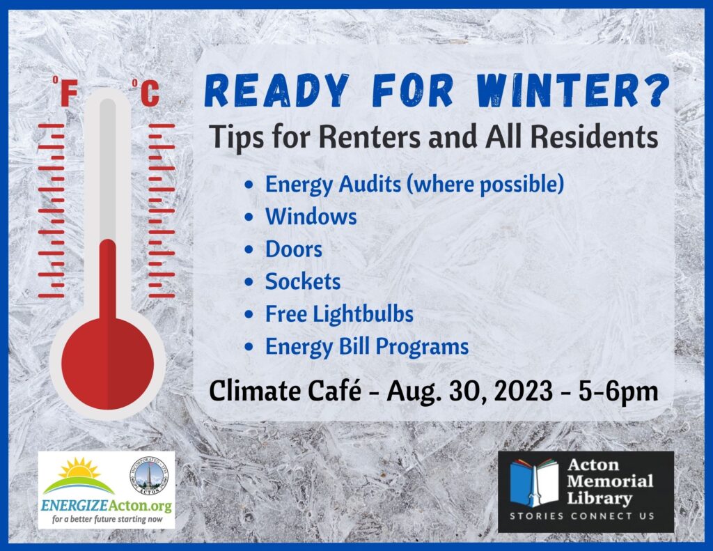 Last winter’s high energy costs were a huge shock to many Acton residents. Renters, in particular, often have fewer options when facing high bills. This Climate Café session will look at strategies to make apartments and homes as energy efficient as possible, including ad hoc tips along with Mass Save resources for homeowners and even for renters (including some hands-on materials). We will also have information about what is happening in the region to address the energy needs of multi-family buildings, along with resources about special fuel assistance programs for income eligible households.
